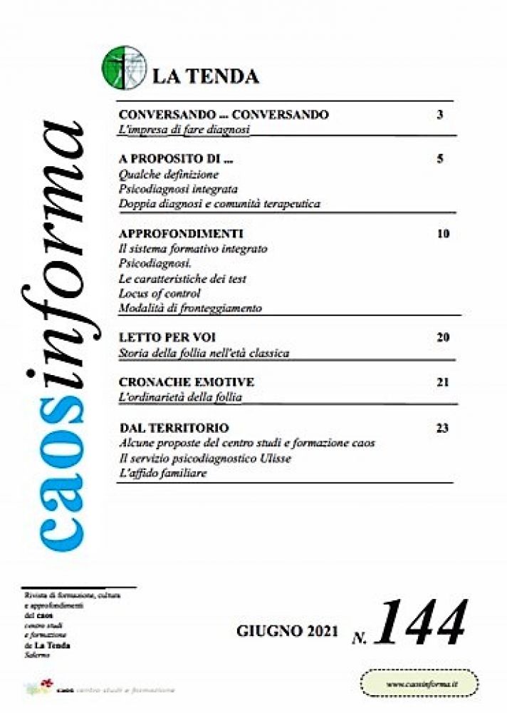 Dopo aver trattato (nel numero 143) il tema delle nuove dipendenze comportamentali e dopo aver introdotto (nel numero 142) il problema della "identita liquida ", proviamo, in questo numero ad approfondire il tema della psicodiagnosi.