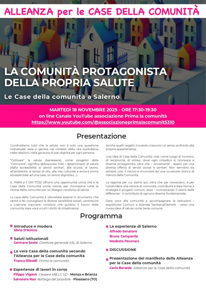 Per fare il punto della situazione sulla realtà salernitana e per confrontarsi con i percorsi in fase più avanzata, l’Alleanza per le Case di Comunità (raggruppamento costituito da svariate organizzazioni del terzo settore, tra cui il Centro La Tenda) promuove un webinar dal titolo “La comunità protagonista della propria salute – Le Case di Comunità a Salerno”, che si terrà martedì 18 novembre 2025 dalle ore 17:30 alle ore 19:30.